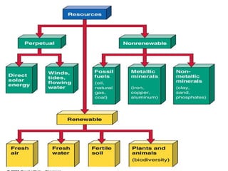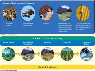 The document discusses environmental ethics and possible solutions to environmental problems. It provides three views on environmental ethics: the libertarian view focuses on equal rights for all human and non-human members; the ecological view sees nature as having its own mechanisms for functioning; and the conservation view sees nature as having instrumental value for human utility. It also discusses disparities between developed and developing countries and identifies population growth, wasteful resource use, poverty, and failure to include environmental costs in market prices as key causes of problems. Three proposed solutions are to rely more on renewable energy, protect biodiversity, and help sustain natural chemical cycles.