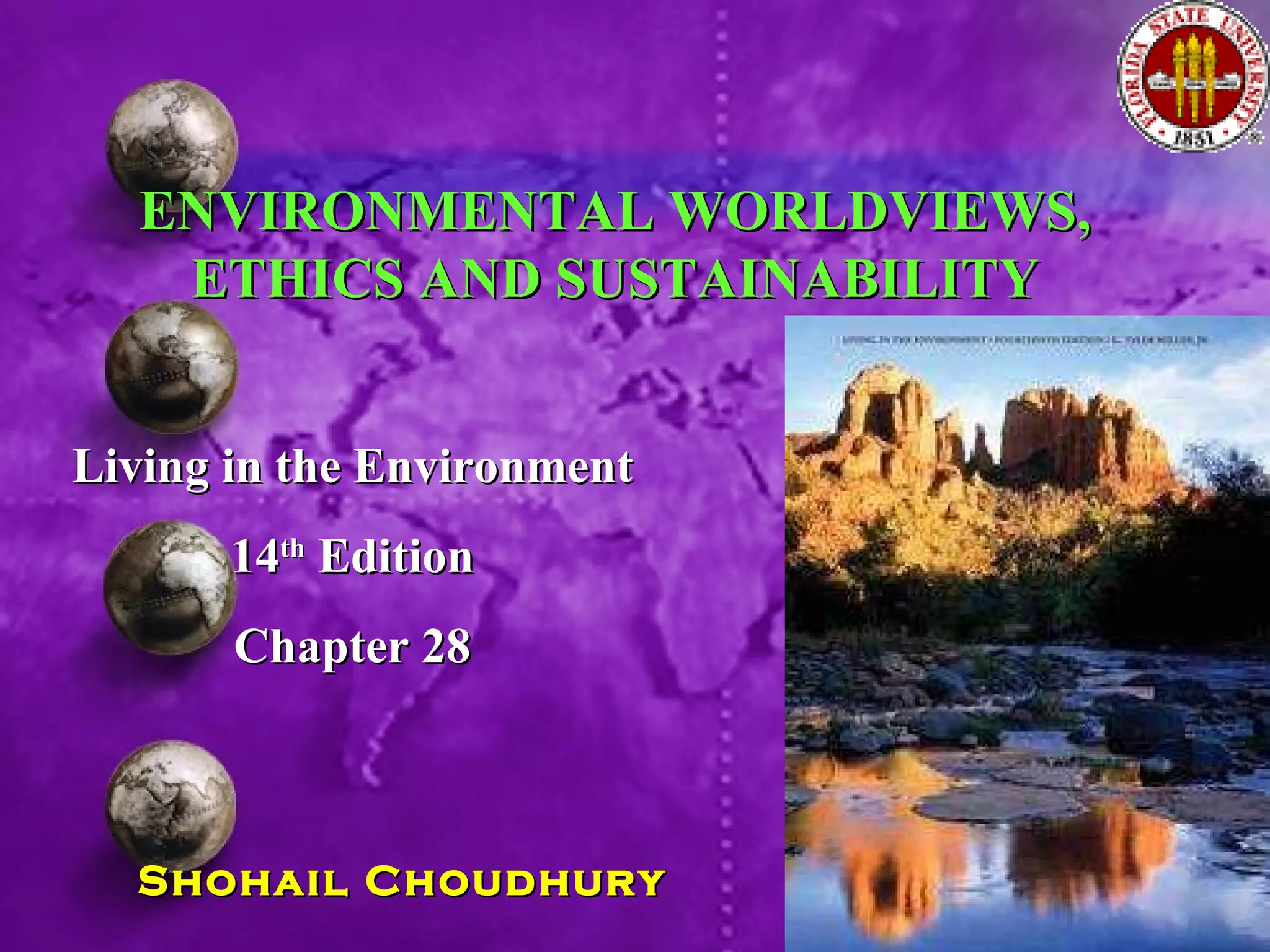 This chapter discusses different environmental worldviews and approaches to environmental ethics. It presents several philosophies for determining what is right and wrong from an environmental perspective, such as utilitarianism which evaluates based on the greatest good, and biocentrism which views all life as intrinsically valuable. It also outlines various worldviews including viewing humans as stewards of the planet versus being in charge of managing Earth. The chapter concludes by discussing the need for environmentally literate citizens to build a more sustainable society through understanding our interactions with nature and effective problem solving approaches.