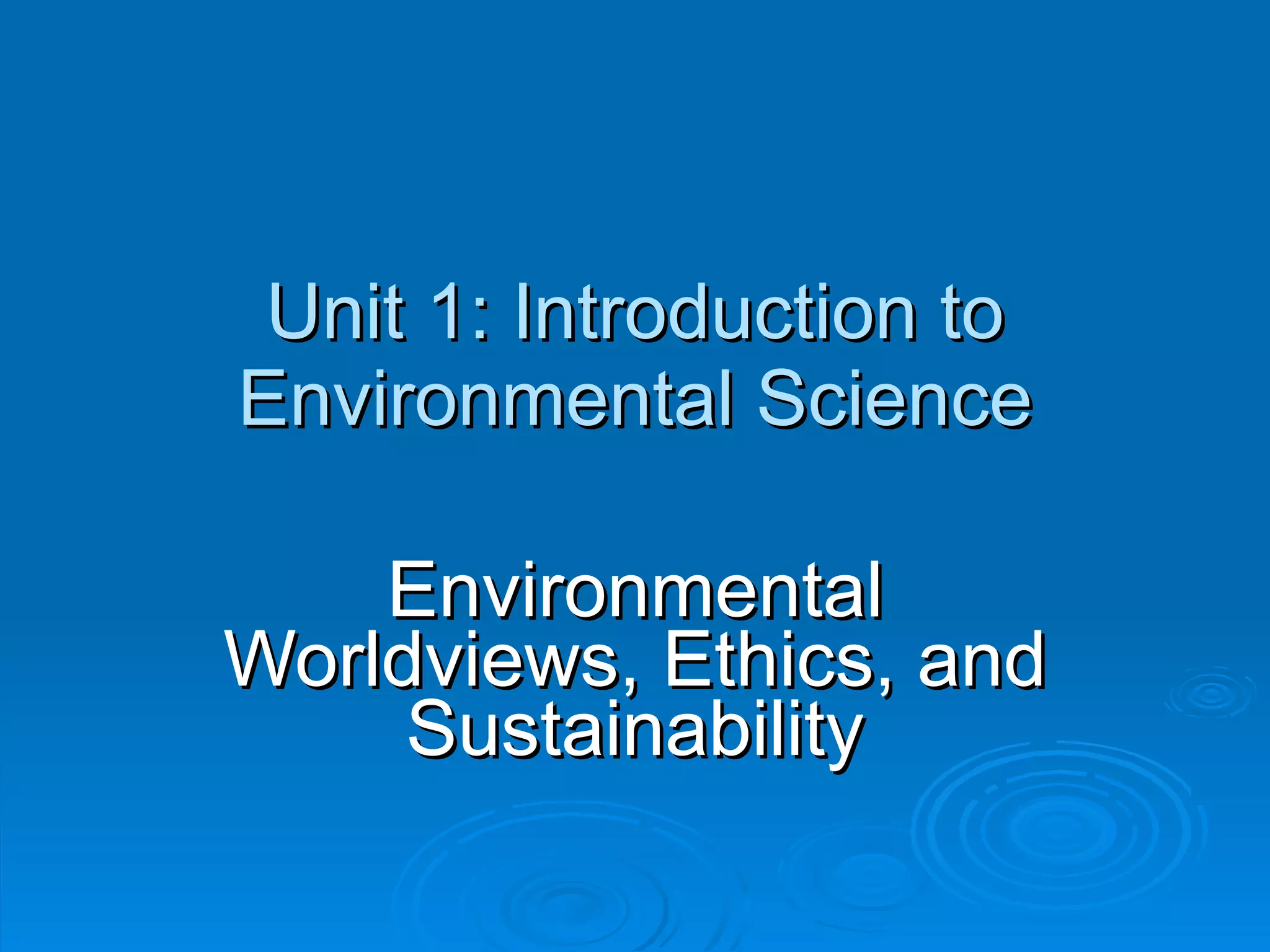 The document discusses different environmental worldviews and ethics related to humanity's relationship with the natural world. It outlines three main worldviews: planetary management, which views humans as apart from nature and able to manage resources for unlimited growth; stewardship, which sees humans as responsible managers of the Earth; and environmental wisdom, which views humans as dependent on and part of nature. It also discusses trends toward more sustainable worldviews and values, as well as strategies for developing more environmentally and socially just societies such as reducing consumption, pollution and waste.