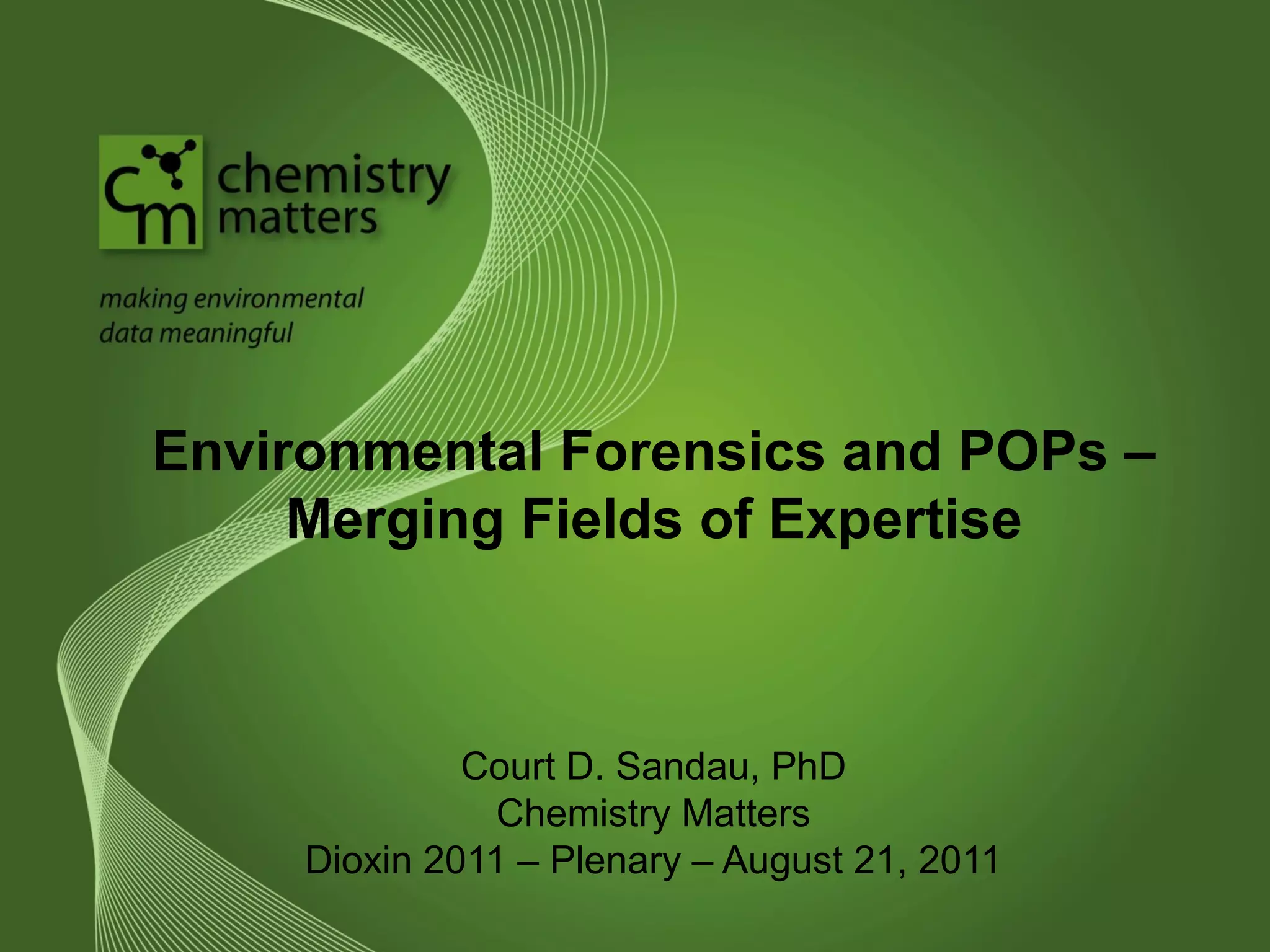 The presentation at Dioxin 2011 discusses environmental forensics, focusing on investigations that link contaminant sources to liability in legal settings. It highlights the evolution of environmental forensics, key techniques for identifying contaminants, and the importance of scientific methods in litigation. The document emphasizes the intersection of various scientific disciplines in accurately determining the origin and impact of environmental pollutants.