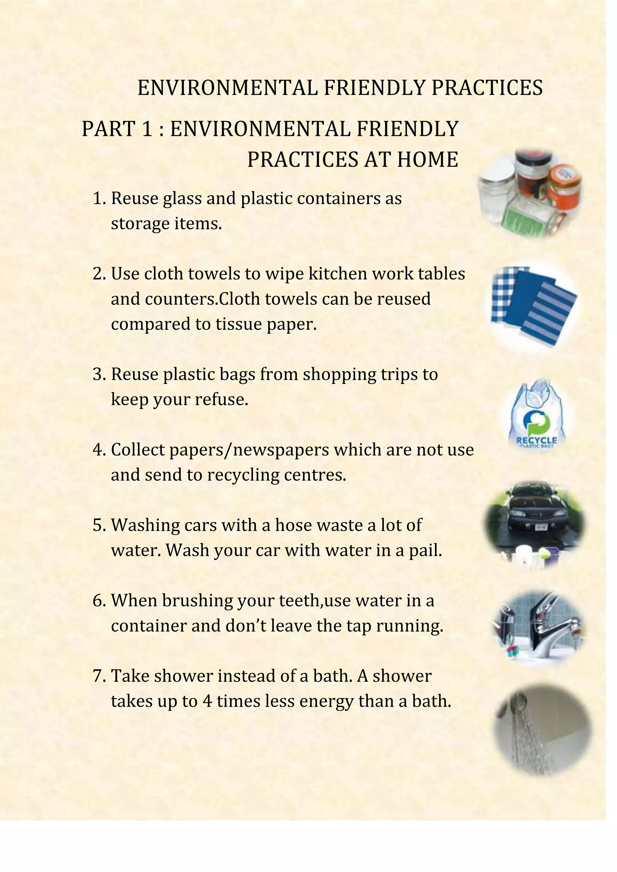 Environmentally friendly practices at home include reusing glass, plastic, and cloth items where possible instead of immediately throwing them away, such as using containers for storage or cloth towels instead of paper towels. The document also recommends collecting papers and newspapers for recycling, washing cars with buckets of water instead of leaving hoses running to save water, and taking showers instead of baths to reduce energy usage.