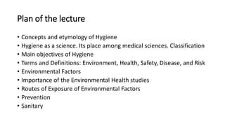 The document discusses environmental hygiene and environmental health. It defines key terms like hygiene, environment, health, disease, and risk. It outlines the main objectives and classification of environmental health science. It discusses the importance of studying environmental factors and their routes of exposure. It also explains concepts of prevention at the primary, secondary and tertiary levels, with a focus on primary prevention measures like health promotion and specific protection.