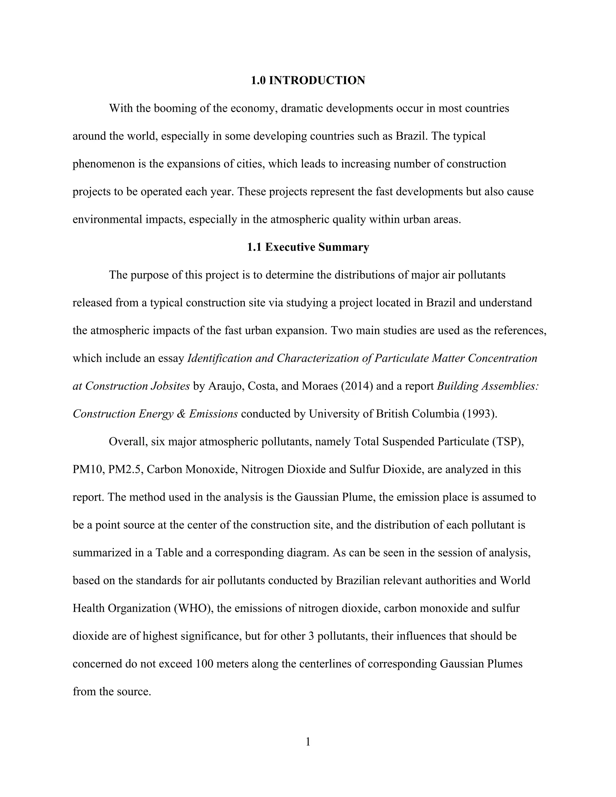 This document provides an analysis of air pollutant distributions from a typical construction site in Brazil. Six major air pollutants are analyzed using the Gaussian plume method. Based on the analysis and air quality standards from Brazil and WHO, emissions of nitrogen dioxide, carbon monoxide, and sulfur dioxide from the construction site pose the highest risk to surrounding areas within 100 meters. Mitigation measures are recommended to control emissions of these pollutants.