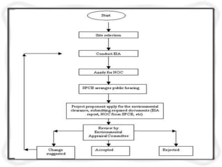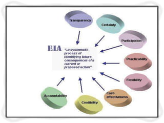 The document discusses environmental impact assessment (EIA), which is defined as systematically identifying and evaluating potential environmental impacts of proposed projects. An ideal EIA system applies to all projects with significant environmental effects, compares alternatives, and includes public participation and enforcement. The goals of EIA are to conserve resources, minimize waste, recover byproducts, efficiently use equipment, and enable sustainable development.