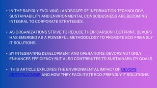 This document discusses the environmental impact of DevOps certifications in promoting eco-friendly IT solutions. It highlights how DevOps practices, such as automation and continuous integration, contribute to sustainability goals by reducing energy consumption and resource wastage. The article emphasizes the importance of various DevOps certifications in equipping IT professionals with the skills necessary to implement sustainable practices and reduce the ecological footprint of organizations.