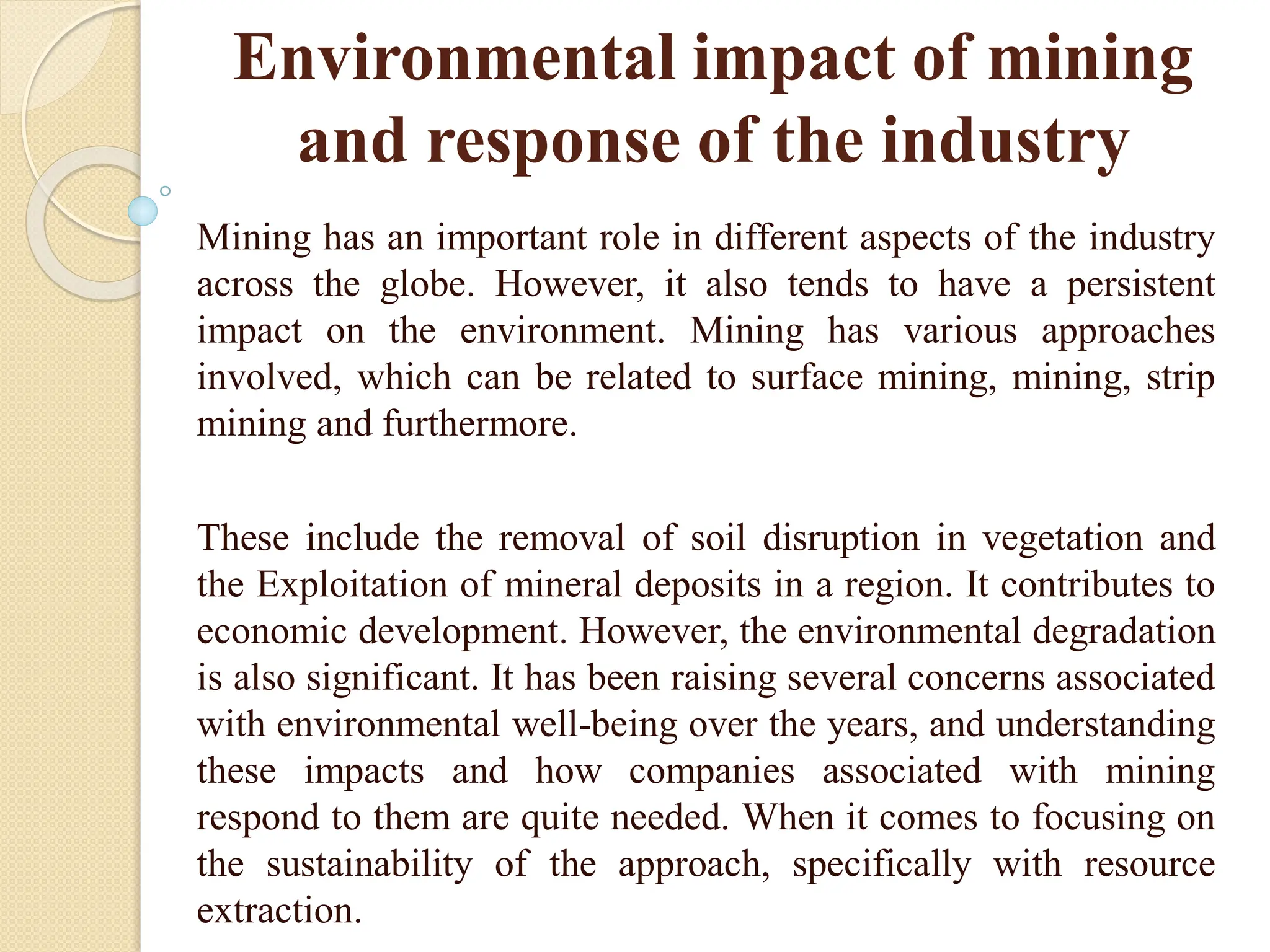 Mining has an important role in different aspects of the industry across the globe. However, it also tends to have a persistent impact on the environment. Mining has various approaches involved, which can be related to surface mining, mining, strip mining and furthermore.
