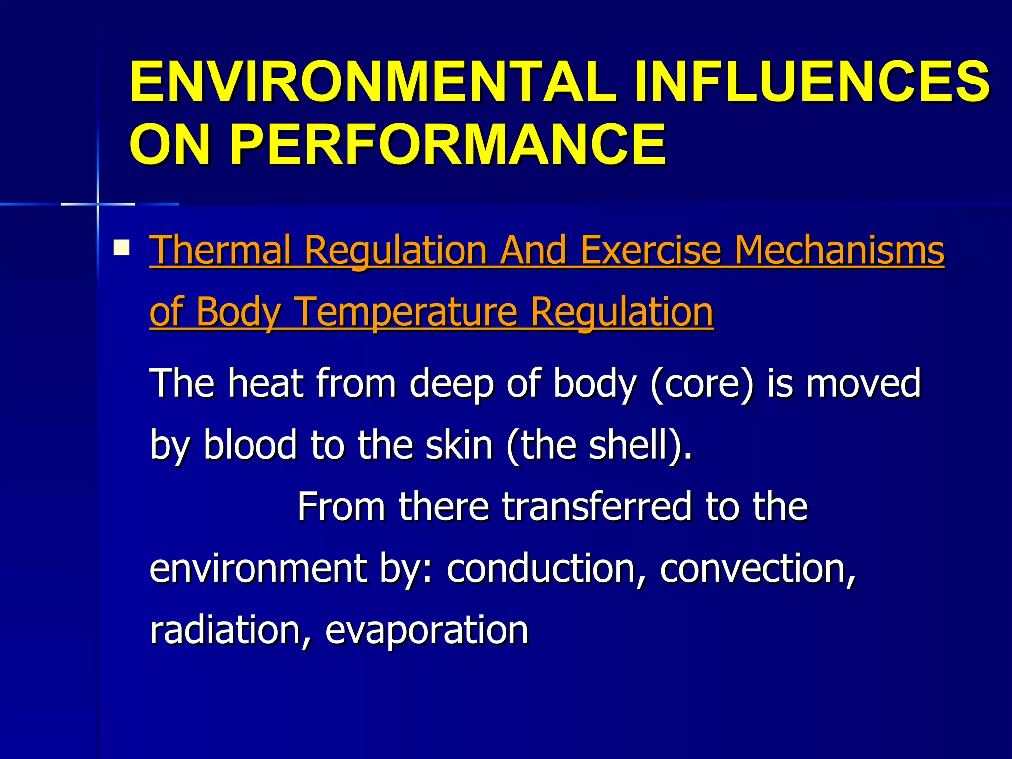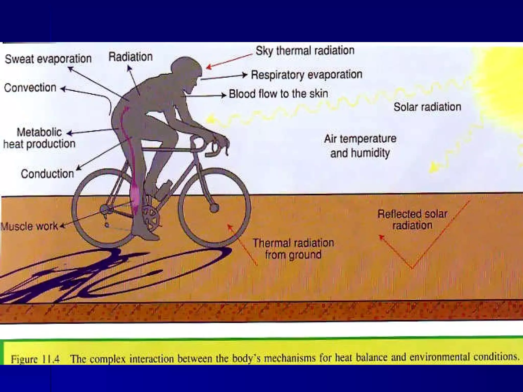 The document discusses environmental influences on human performance during exercise in various conditions. It covers mechanisms of body temperature regulation and how factors like humidity, air temperature, and hydration impact heat exchange. It also discusses physiological responses to exercise in heat, cold, high altitude/hypobaric, underwater/hyperbaric, and microgravity environments, as well as health risks associated with exercising in extreme environments like heat stroke, hypothermia, altitude sickness, and decompression sickness.