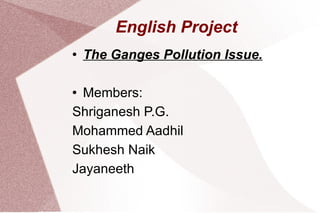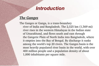 The Ganges river is highly polluted due to sewage and industrial waste from cities along its banks, as well as religious offerings and bodies that are placed directly into the river according to Hindu traditions. This pollution has created severe health issues for those who live near the river. The Ganga Action Plan was launched in 1985 to address this pollution but failed due to issues like a lack of cooperation between government bodies and technical experts, as well as insufficient monitoring and public awareness campaigns. Stronger measures are needed like improved sewage treatment, industrial waste regulation, public education, and inter-governmental cooperation to successfully restore the Ganges river.
