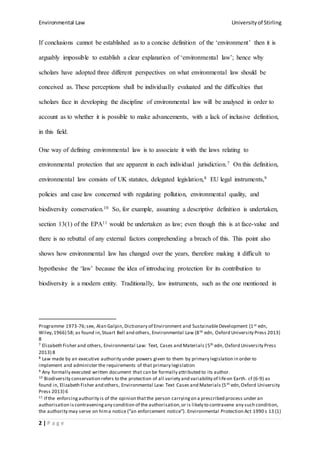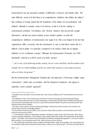 This document discusses the difficulties in defining environmental law. It notes that there is no universally agreed upon definition, and scholars have different perspectives. One view is that environmental law consists of statutes, regulations, and case law related to environmental protection in a given jurisdiction. However, this has problems, as environmental issues involve more than just legal instruments. A broader view is that environmental law aims to achieve environmental policy goals through legal means. The document examines these different approaches and their limitations in comprehensively capturing the field of environmental law.