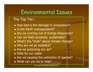 The document provides an overview of key environmental issues and discusses strategies for improving environmental literacy. It begins by outlining the "4 A's" of environmental education - awareness, appreciation, advocacy, and activism. It then discusses principles of environmental sustainability and interdependence. The document summarizes several major environmental issues including damage to ecosystems, population growth, energy resources, food supply, climate change, waste, air and water pollution, and species extinction. It emphasizes the need for individual action and provides specific recommendations for more sustainable living.