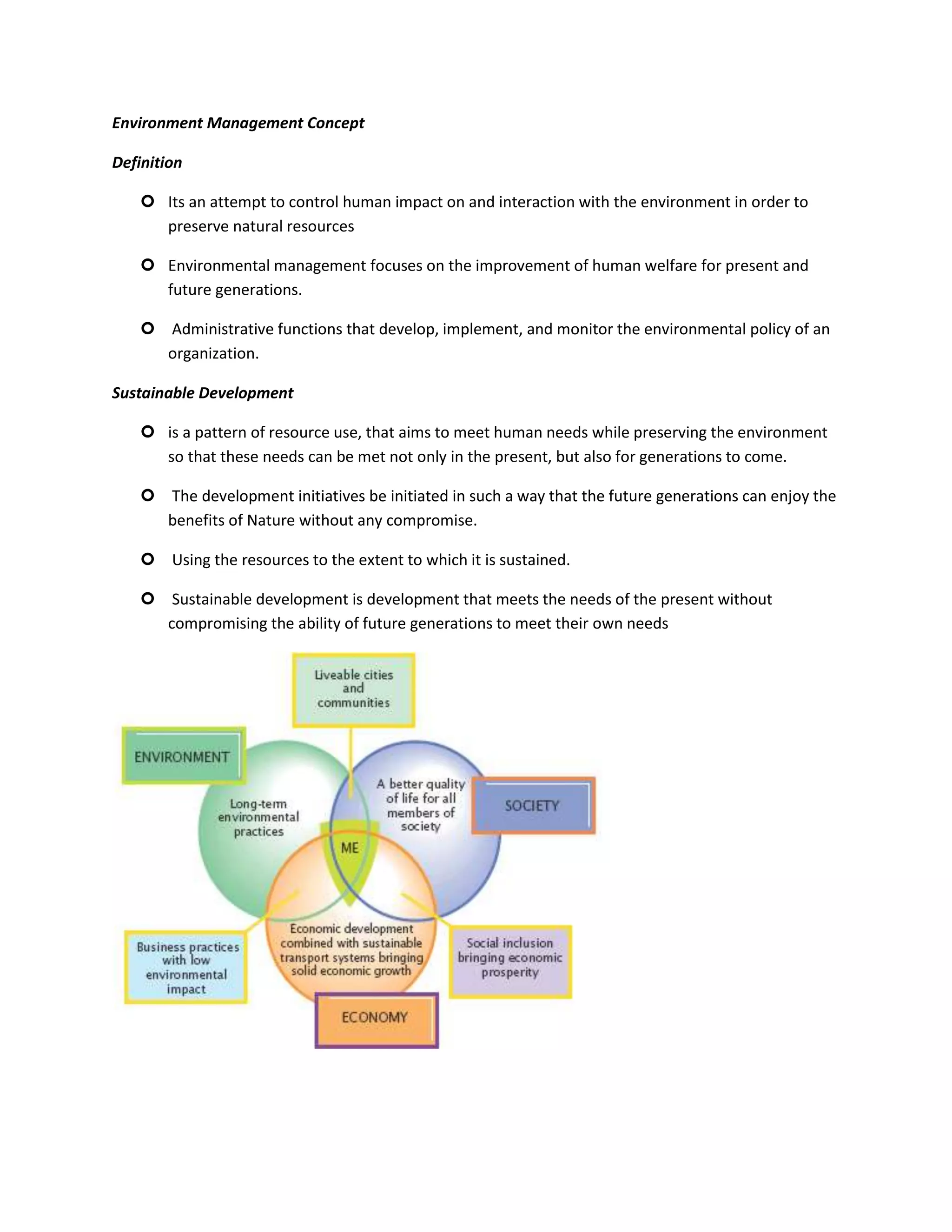 Environmental management aims to control human impact on the environment to preserve natural resources and improve human welfare. It focuses on developing and implementing environmental policy. Sustainable development meets present needs without compromising future generations' ability to meet their own needs. India faces many environmental issues like pollution, degradation of land and forests, and loss of biodiversity due to factors like population growth, urbanization, and industrialization. The national environmental policy aims to mainstream environmental concerns in development and achieve conservation, equity, and sustainability.