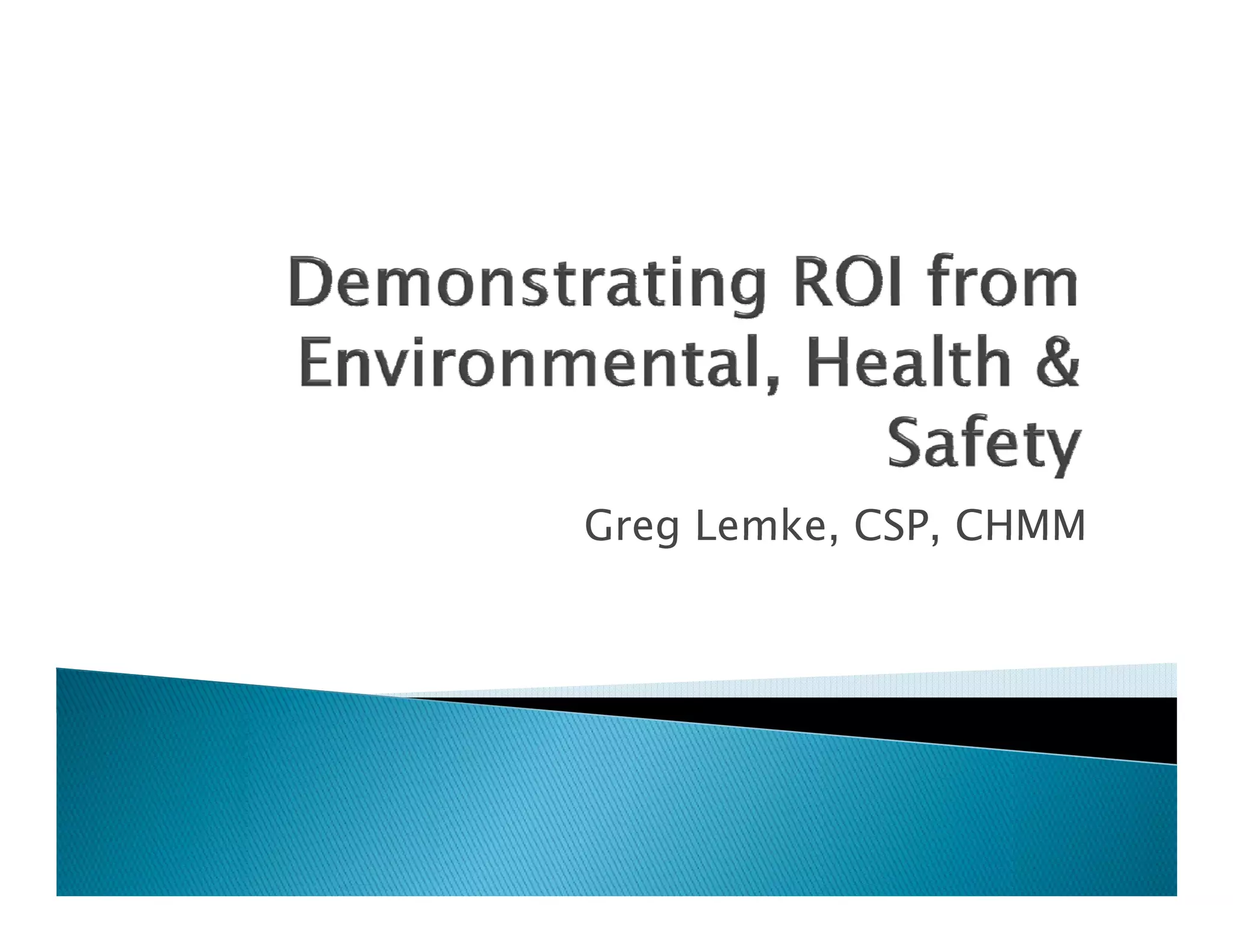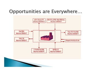 This document discusses moving from a regulatory compliance approach to environmental management to an environmental management system approach focused on continuous improvement and cost savings. It outlines ideas for the future, including measuring sustainability and developing verifiable sustainability reporting. The document emphasizes that environmental, health and safety investments can provide returns like increased financial performance, cost savings, and strengthened brand value.