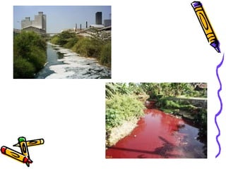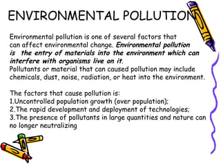 Environmental pollution can occur in air, water, soil, and noise. Air pollution includes gases like carbon monoxide and dioxide which can contribute to global warming. Water pollution is caused by industrial waste, pesticides, and organic matter which reduce oxygen levels. Soil pollution results from trash, chemicals, and fertilizers. Noise pollution comes from vehicles, planes, and loud sounds. Pollution disrupts ecosystems, reduces soil fertility, and harms human health.