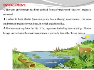 Environmental pollution can be defined as any undesirable change in the physical, chemical, or biological characteristics of air, water and soil that can harm living organisms. This document discusses various types of environmental pollution such as air pollution, water pollution, soil pollution, and noise pollution. It provides details on the causes, sources and effects of different types of pollutions and methods to control pollution.