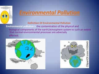 Environmental pollution is the contamination of Earth's physical and biological systems, adversely affecting natural processes. Major types include air, water, and soil pollution, each caused by various human activities that lead to significant health and environmental consequences. The document discusses the sources and effects of pollution, highlighting issues like air quality deterioration, waterborne diseases, and soil contamination's impact on health and ecosystems.