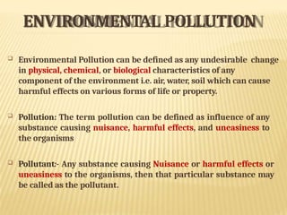 Environmental pollution means the contamination of natural resources (air, water, soil, etc.) due to harmful human activities.