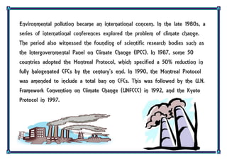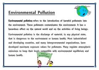 The document discusses environmental pollution and its effects. It defines environmental pollution as the introduction of harmful pollutants into the environment. These pollutants can contaminate the environment and have hazardous effects on plants, animals, humans, and materials. The document also discusses how environmental pollution has become an international concern, with various international agreements and protocols established to address issues like climate change and the reduction of pollutants.