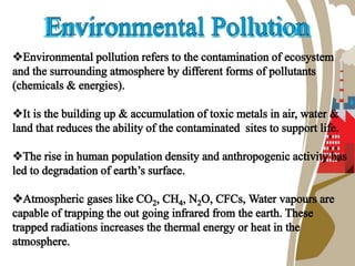 The document discusses various forms of environmental pollution including air, soil, water, noise, and thermal pollution, outlining their sources, effects on human health, flora, fauna, and the environment, along with prevention and control measures. It highlights the impacts of pollutants such as respiratory diseases in humans, damage to vegetation, and harm to aquatic life, while stressing the urgency of addressing these issues to mitigate global warming and ecological degradation. The text emphasizes individual responsibility in reducing greenhouse gas emissions and implementing sustainable practices to preserve the environment.