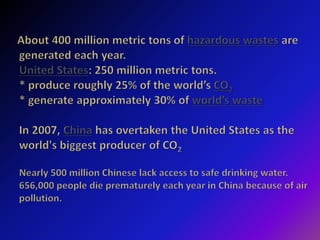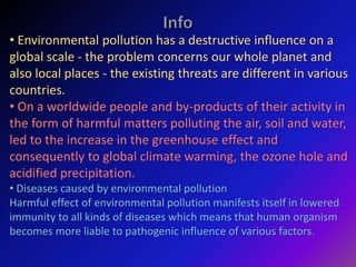 Environmental pollution poses a significant global threat, affecting air, water, and soil quality and leading to health issues like respiratory diseases and reduced immunity. Major pollutants include harmful chemicals from industrial activities, sewage, and genetically modified organisms, with significant health impacts evident in areas with heavy pollution. Solutions like organic farming, improved air and water quality management, and pollution control regulations are critical to mitigate these harmful effects.