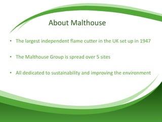 Malthouse Engineering, the largest independent flame cutter in the UK, has implemented a rainwater harvesting system to improve sustainability, using employee suggestions to reduce costs and resource usage. The system currently recycles about one cubic meter of rainwater daily and is projected to achieve payback within 1-2 years. The company is also developing improvements for operational efficiency and exploring further environmentally friendly initiatives, including expansion into biomass and renewable energy machinery.