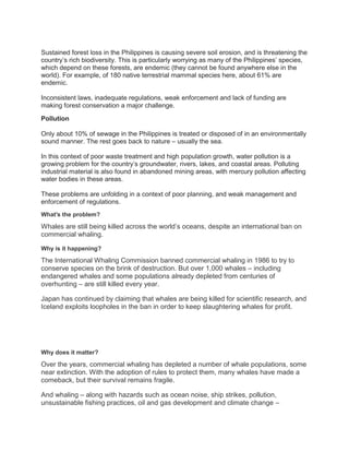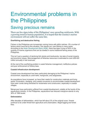 Overfishing, coastal development, deforestation, and pollution are major environmental problems threatening the Philippines' marine and land environments. Overfishing has led to a 90% drop in some fisheries' catches and costs $420 million annually. Coastal development including infrastructure, aquaculture, and reclamation has damaged coral reefs, mangroves, and seagrasses, reducing mangroves to 36% of historic levels. Deforestation endangers biodiversity as many endemic species depend on forests, which cover only 3% of original area. Poor waste treatment pollutes water sources as only 10% of sewage is treated. Weak enforcement of regulations exacerbates these problems.