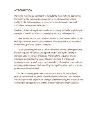 The textile industry has a significant environmental impact through its various production processes and use of many chemicals. It generates large volumes of wastewater containing dyes, chemicals, and other pollutants from wet processing. This wastewater causes water pollution if not properly treated before discharge. Air pollution is also generated from drying and heat-setting processes. Solid waste from fabric scraps and packaging materials is another output. Proper treatment of wastewater, emissions controls on air pollution sources, and recycling or proper disposal of solid waste can help reduce the industry's environmental impact.