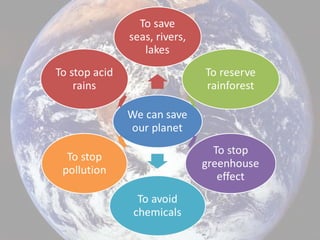 This document outlines the objectives, motto, and topics of an environmental protection lesson, which are to discuss ecological problems facing the planet like land pollution, greenhouse effect, air pollution, water pollution, ozone holes, climate change, and acid rain. It aims to examine the causes of environmental issues and ways to solve these problems in order to lessen pollution and protect the environment. Students are assigned to write suggestions on environmental protection for a newspaper as homework.