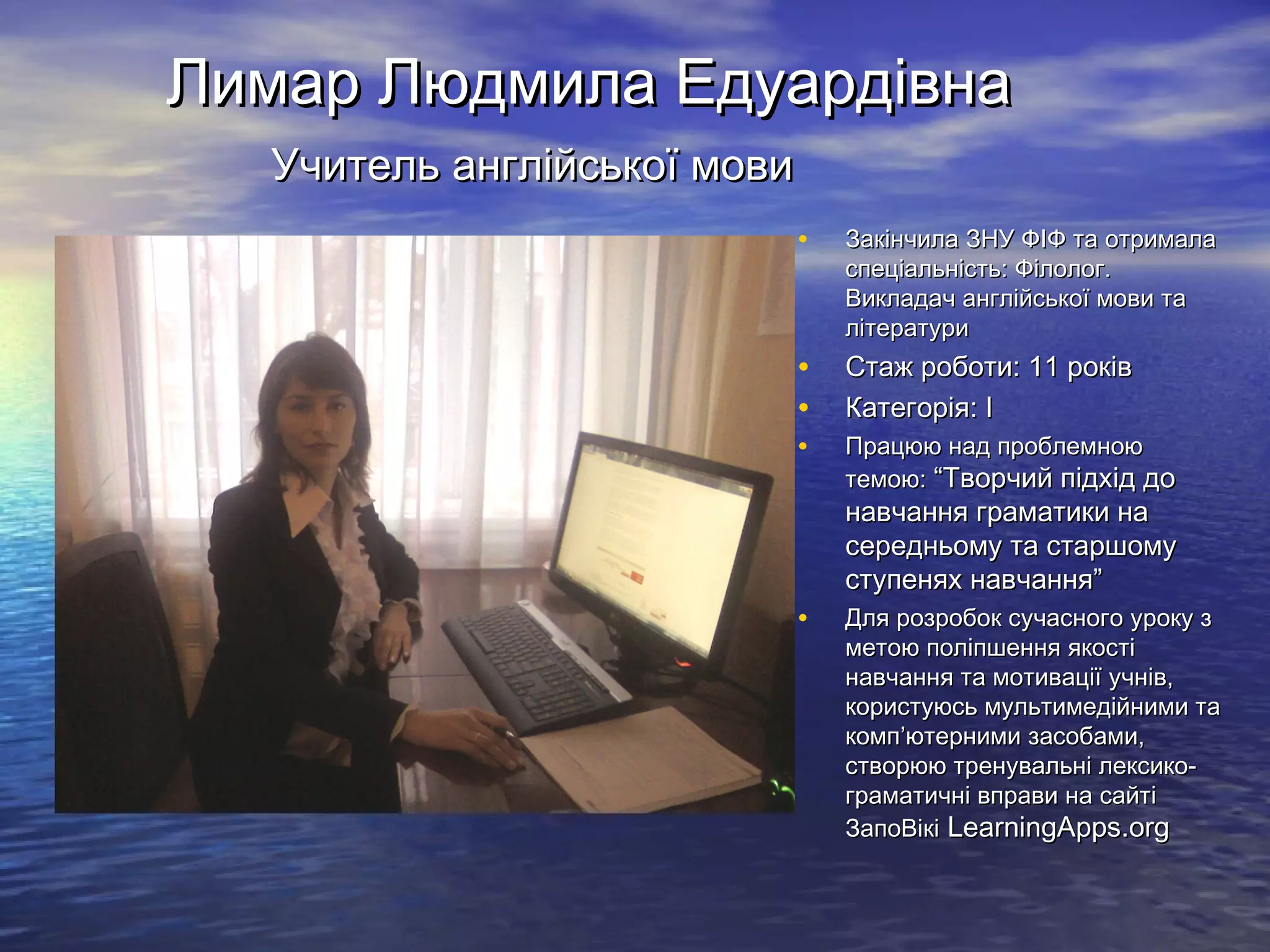 This document contains biographical information about a teacher named Lyudmila Eduardivna Lymar. It states that she graduated from Zhytomyr National University with a specialization in Philology. She has been working as an English language and literature teacher for 11 years and holds the first category. She is currently working on the problem "Creative Approach to Teaching Grammar at Secondary and Senior Levels." To develop modern lessons and improve the quality and motivation of student learning, she uses multimedia and computer tools and creates lexical and grammatical exercises on the LearningApps.org website.