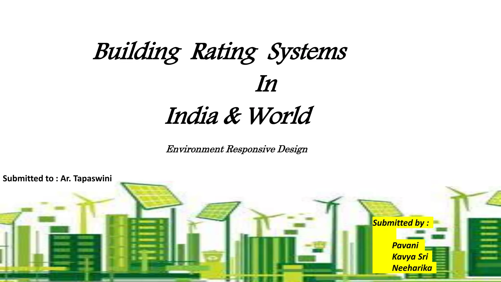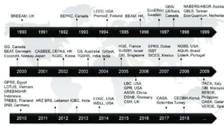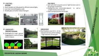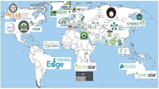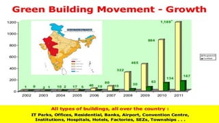 This document provides information on building rating systems in India and around the world. It discusses several prominent green building rating agencies and programs, including IGBC, GRIHA, LEED, BREEAM, and CASBEE. It also describes key Indian organizations that promote sustainable building practices, such as TERI and their GRIHA rating system. Case studies of green buildings in India are presented. The goals and criteria of the GRIHA and IGBC rating systems are outlined in detail.