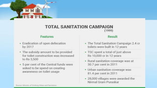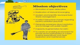 Environmental sanitation aims to improve health through applying sanitation principles to control the environment. It promotes health and prevents disease. Components include water sanitation through safe drinking water and toilets, waste disposal through proper management and methods like dumping and composting, food sanitation through hygienic practices, and air sanitation to prevent pollution and its health effects. Sanitation must be maintained at both household and community levels, such as through community-level campaigns in India like Swachh Bharat Mission and laws protecting the environment.