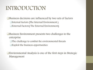 The document provides an overview of environmental scanning for strategic management. It defines environmental scanning as monitoring, evaluating, and disseminating internal and external environmental data to identify opportunities and threats. The external environment includes factors in the micro environment like suppliers, customers, and competitors, as well as macro factors like economic, political, sociocultural, demographic, and technological forces. Understanding these external factors is important for strategic decision making and adapting to changes. The internal environment also influences strategy and includes internal resources, management structure, and company culture. Regular environmental scanning allows companies to avoid surprises and ensure long term success.