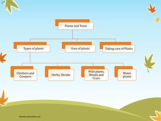 This document discusses different types of plants and their uses. It describes climbers, creepers, herbs, shrubs, wild plants, weeds, and water plants. It explains that plants are used for food, wood, paper, fibers, perfumes, medicines, and cleaning the air. Specific plants are mentioned for each use. The document also provides care instructions for plants, such as watering, cleaning leaves, and providing sunlight and care in public places.