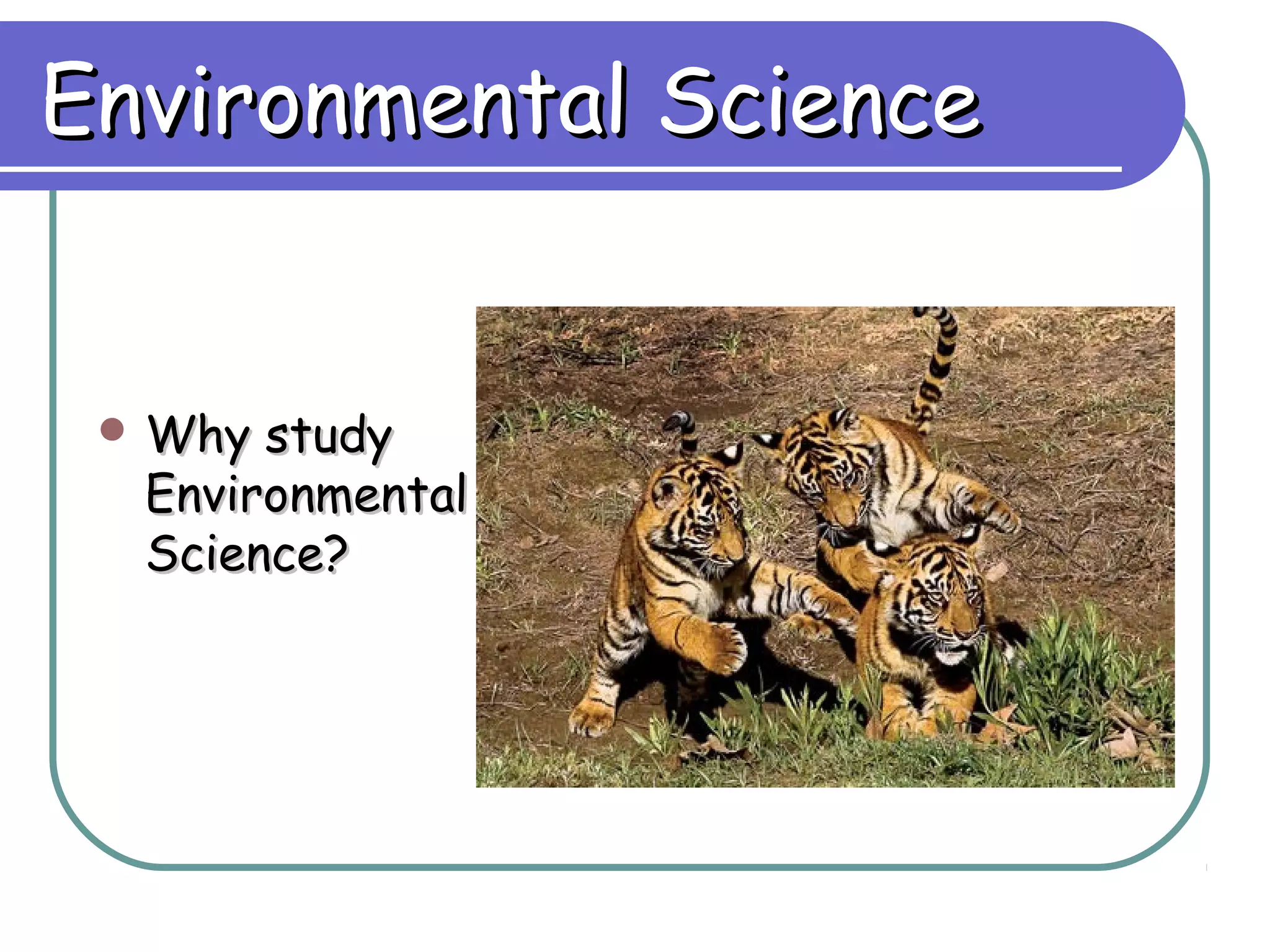 Environmental science is an interdisciplinary field that studies how Earth systems function and how human activity impacts the planet. It addresses growing environmental concerns like population growth, resource depletion, loss of biodiversity, and climate change. Understanding science, sustainability, and our role as stewards of the planet can help us develop solutions to environmental problems and leave a habitable world for future generations.
