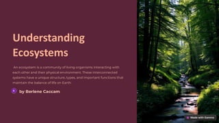 The document provides an overview of ecosystems, highlighting the interconnectedness of living organisms and their environments. It explains various forms of biodiversity, ecosystem roles, signs of unhealthy ecosystems, and threats to species, along with the important ecosystem services they provide. Key ecological concepts such as interdependence, nutrient cycling, and resilience are also discussed.
