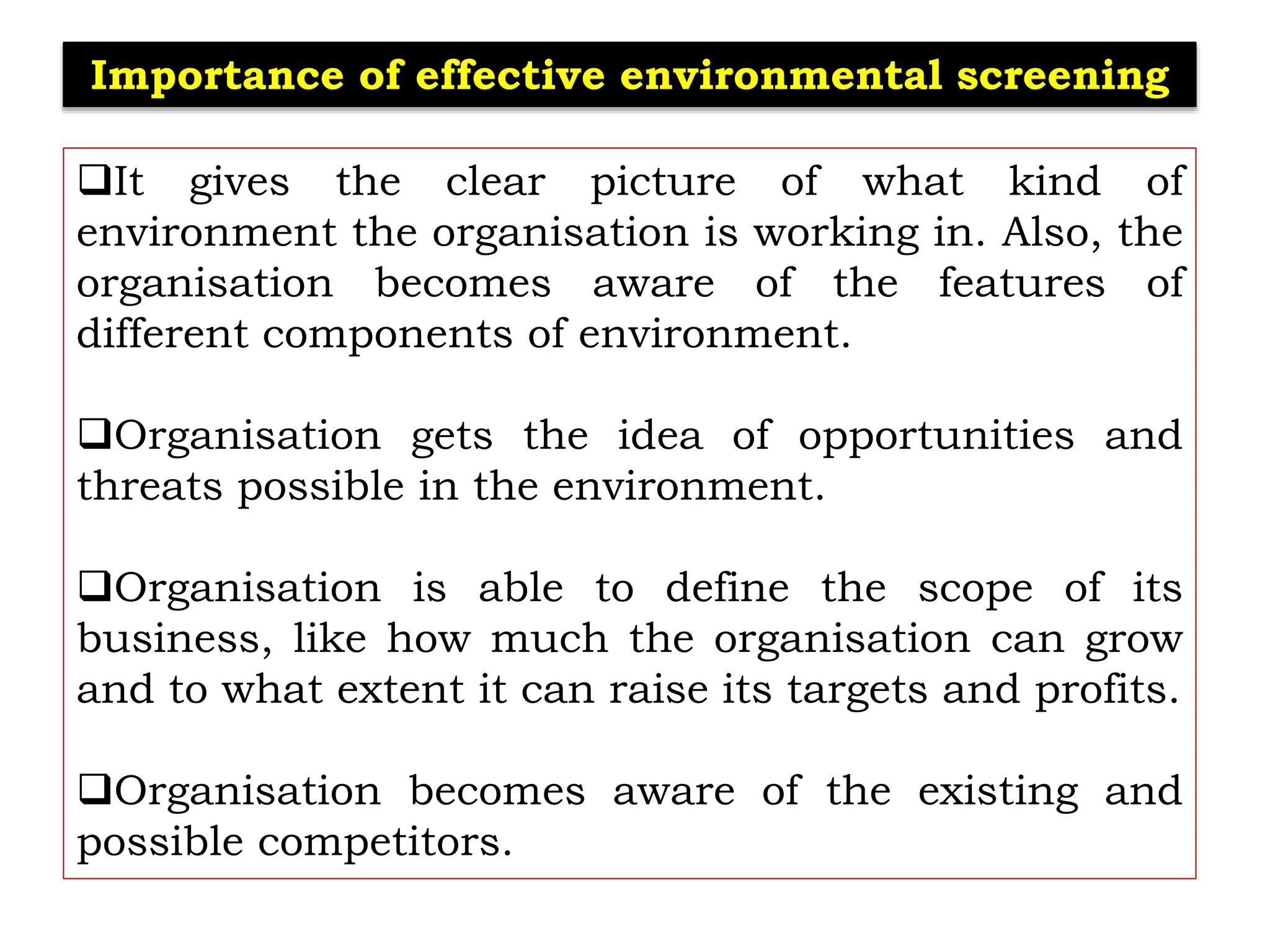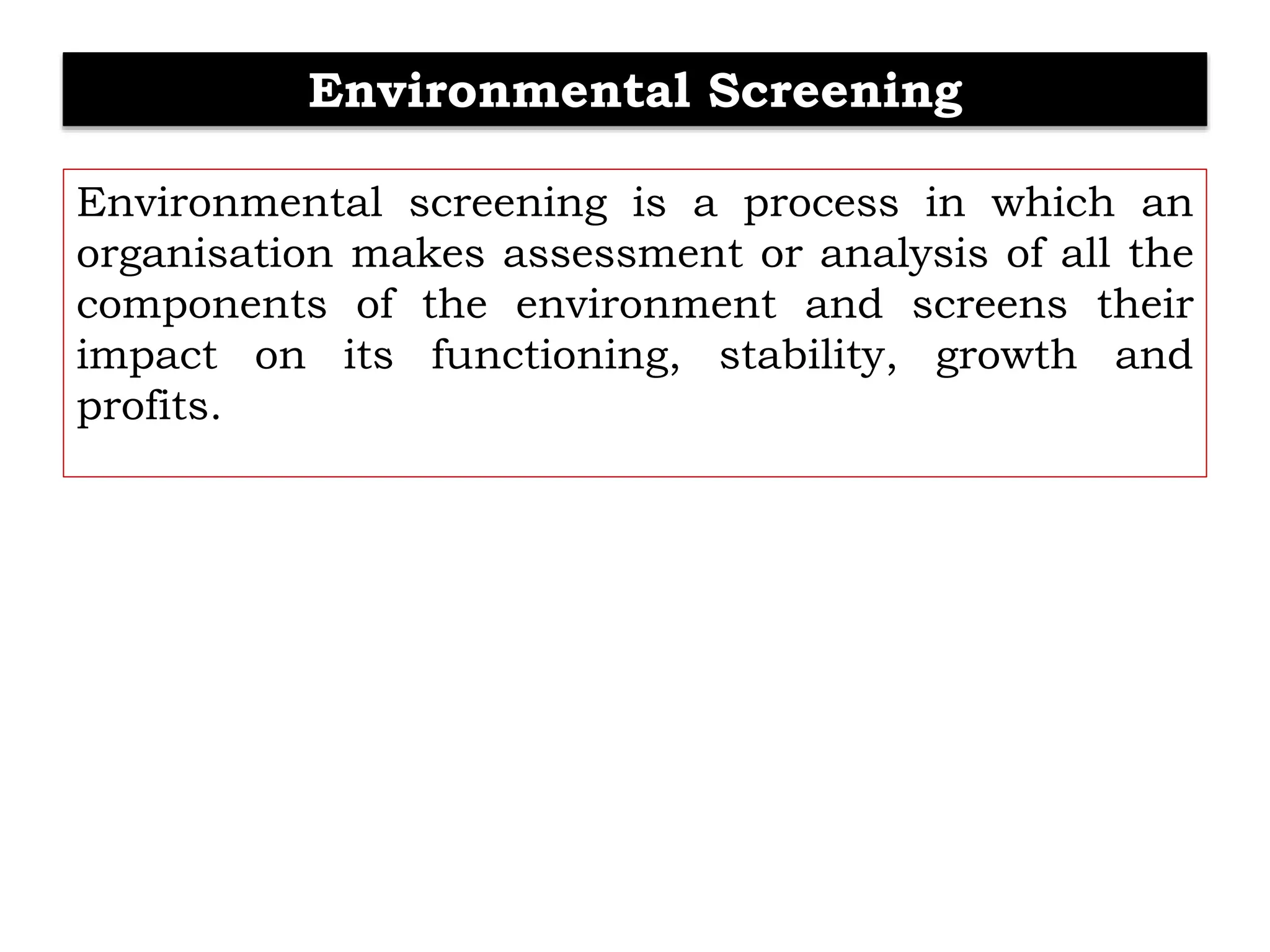Environmental screening involves assessing all environmental factors that could impact an organization's functioning, growth, and profits. It is important as it allows organizations to understand opportunities and threats in the environment, define their business scope, and stay aware of competitors. Continuous monitoring keeps organizations aware of future challenges and helps them improve based on customer choices. Business environmental analysis involves scanning, monitoring, forecasting, and assessing the external environment to develop appropriate strategies.