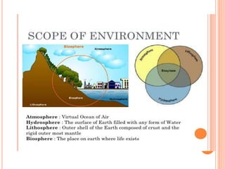 This document provides an overview of environmental studies as a subject. It defines environment and environmental literacy. Environmental studies deals with issues affecting living organisms and draws from many disciplines. The document discusses the scope of environmental studies, including natural history, dependence on nature, renewable and non-renewable resources. It also addresses the importance of environmental studies and provides examples of key environmental thinkers and leaders in India.