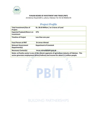 This document provides a project profile for an environmentally controlled poultry farm in Punjab, Pakistan. The farm would house 60,000 broiler birds in controlled sheds to overcome issues like heat stress and disease. The fully automated farm would raise 7 flocks per year over 6 week cycles to be sold to traders and urban markets. With a total investment of Rs. 38.43 million on 3 acres of land, the project is expected to have a payback period of less than one year and return on investment of 37%. The focal person for the project is Dr. Imran Ahmad at the Punjab Board of Investment and Trade.