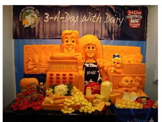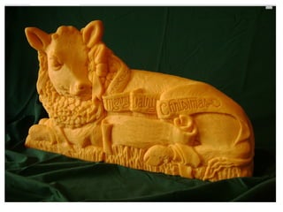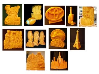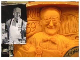 Sarah "The Cheese Lady" Kaufmann is an artist from Wisconsin who creates environmentally friendly sculptures out of cheese. She has been sculpting cheese for 16 years and manages a dairy farm. Her inspiration comes from growing up surrounded by dairy farms in Wisconsin. She sculpts cheese to educate people about cheese varieties and flavors. Her process involves carving blocks of cheese using basic tools in a temperature controlled room and leaving the sculptures to harden.