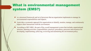 An environmental management system (EMS) provides an organized framework for companies to manage their environmental impacts and responsibilities. The international standard ISO 14001 outlines requirements for an effective EMS. Key elements of an EMS include establishing environmental goals and targets, implementing plans to meet those targets, monitoring performance, and taking actions to continuously improve environmental protection. Environmental auditing evaluates compliance with regulations and the effectiveness of an organization's EMS in managing its environmental aspects. Common types of environmental audits are compliance audits, management system audits, and audits that assess specific areas like energy use, waste generation, or a product's lifecycle impacts.