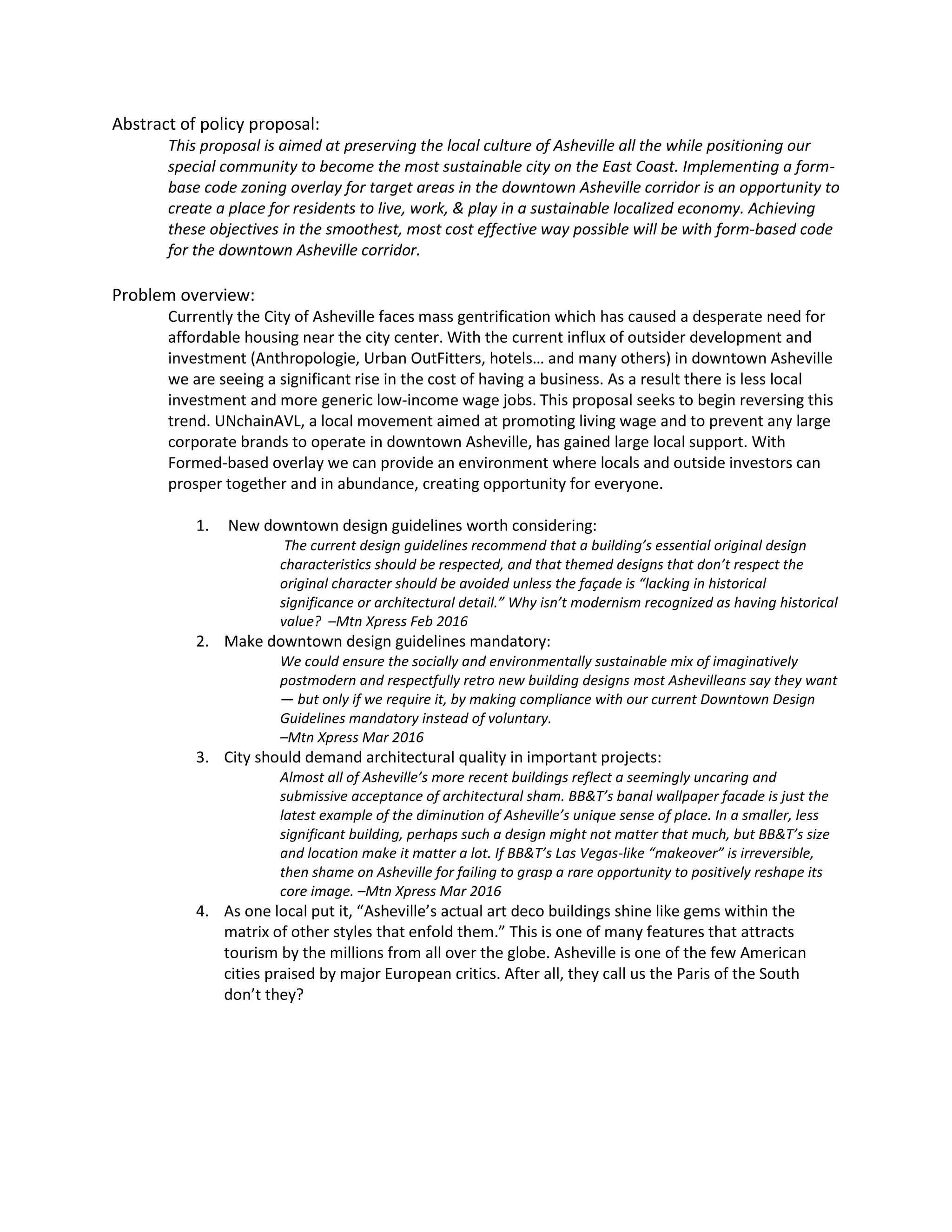 This proposal aims to preserve Asheville's local culture while making it a more sustainable city through implementing a form-based code zoning overlay for downtown Asheville. This would create an environment for living, working and playing in a localized economy. The form-based code would balance development and affordability by setting clear guidelines for developers. It would also ignite community discussions about the future of downtown. The proposal seeks to reverse gentrification trends by requiring architectural quality, promoting walkability and mixing uses while respecting the city's character.