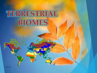 This document describes the major terrestrial biomes found around the world, including tropical rainforests, temperate deciduous forests, taiga, grasslands, savannas, tundra, and deserts. For each biome, it discusses location, abiotic factors, characteristic plant and animal adaptations, threats, and examples of species found within that biome. The biomes are grouped according to dominant vegetation, precipitation levels, and temperature ranges that create distinct environmental conditions for the plants and animals living in each one.