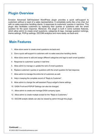 The Envision Advanced Self Assistant is a WordPress plugin designed to provide real-time self-support to customers without the need for a sales representative. It allows store owners to create smart questions, manage categories and tags, and analyze customer interactions via a back-end interface. The installation and configuration process is straightforward, guiding users through logging in and setting up the plugin efficiently.