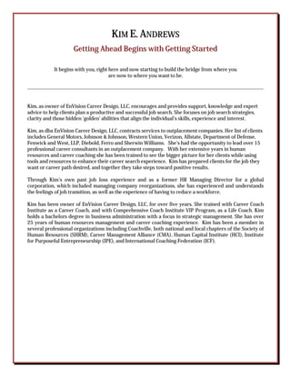 More than 55% of people are unhappy with their jobs, feeling underemployed, disengaged, or unemployed. EnVision Career Design offers career coaching, consulting, and job search strategies to help clients make their career dreams a reality through resume reviews, interview preparation, assessments to discover skills and interests, and guidance for entrepreneurs. Owner Kim Andrews draws on over 25 years of HR experience helping clients such as GM, J&J, and Verizon find jobs that fit their skills and purpose.