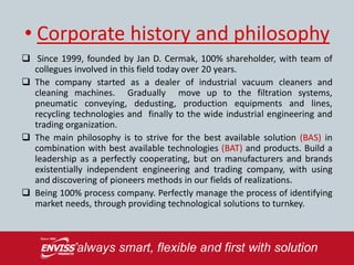 The document outlines the agenda for a meeting, including discussing ENVISS PRODUCTS' corporate history, mission, vision, regions of operation, product range, industries served, applications, systems, tools, communication practices, quality standards, customers, and technologies. It provides an overview of the company and what will be covered during the meeting.