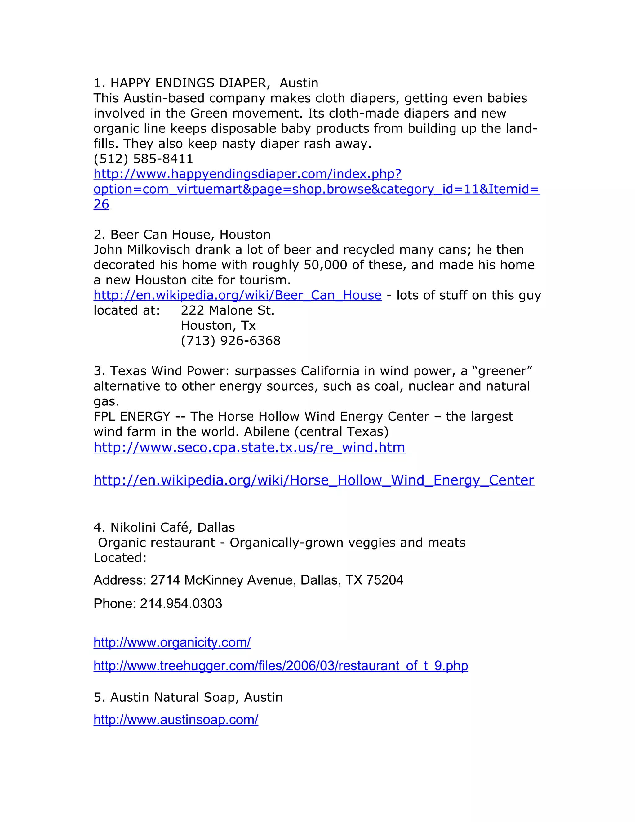 This document lists several green businesses in Texas, including Happy Endings Diaper in Austin, which makes cloth diapers to reduce disposable waste in landfills. It also mentions the Beer Can House in Houston decorated with over 50,000 recycled beer cans, and notes that Texas leads the nation in wind power generation at wind farms like the Horse Hollow Wind Energy Center in Abilene. Additionally, it provides information on organic and eco-friendly restaurants and shops in major Texas cities such as Nikolini Café and Therapy in Dallas and Austin Natural Soap in Austin.