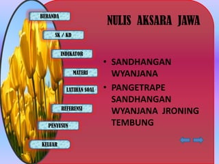 Dokumen ini membahas tentang materi Aksara Jawa, termasuk sandhangan dan berbagai latihan soal terkait. Tujuannya adalah untuk meningkatkan kemampuan menulis dan memahami Aksara Jawa di tingkat sekolah menengah. Indikator yang digunakan meliputi kemampuan mengungkapkan pikiran dan menulis kalimat dengan benar menggunakan Aksara Jawa.