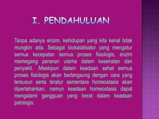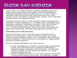 1. Enzim merupakan protein yang berfungsi sebagai katalisator reaksi kimia dalam sistem biologi.