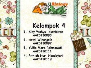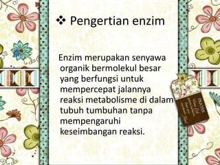 Kelompok 4 terdiri dari 4 mahasiswa yang mengerjakan tugas tentang enzim. Dokumen ini memberikan informasi mengenai definisi enzim, komponen, sifat, jenis, cara kerja, sintesis, faktor yang mempengaruhi aktivitas, dan penggunaan enzim dalam kehidang seharian.