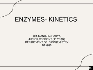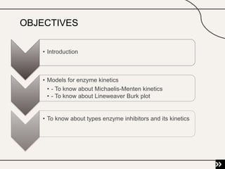 1) The document discusses enzyme kinetics and the Michaelis-Menten model of enzyme kinetics.