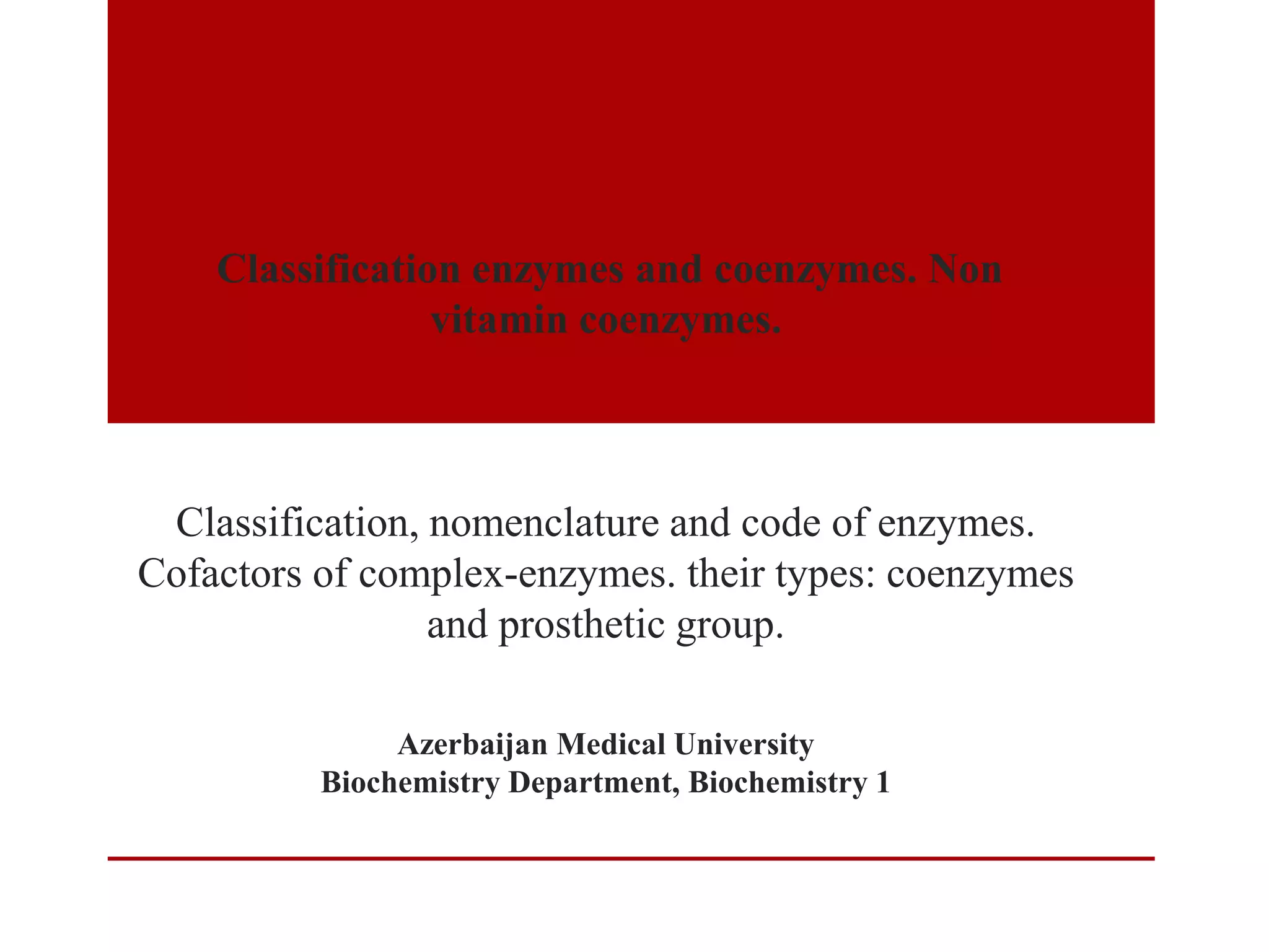 This document discusses enzymes and coenzymes. It begins by defining enzymes as protein catalysts that increase reaction rates without being used up in the process. It then discusses the classification, nomenclature, and properties of enzymes. The document also discusses coenzymes, which are organic molecules that bind to enzymes to form active holoenzymes. Several important coenzymes are described, including NAD+, FAD, thiamine pyrophosphate, biotin, and coenzyme A. The document emphasizes that coenzymes transfer chemical groups or electrons to carry out redox reactions and are regenerated at the end of the reaction cycle.